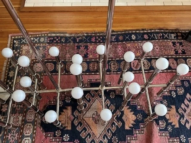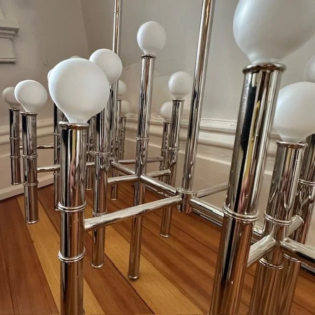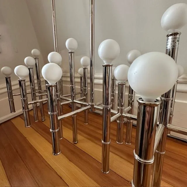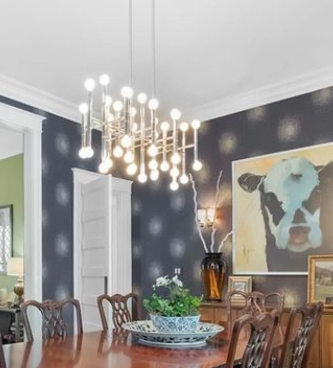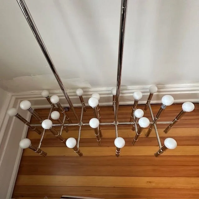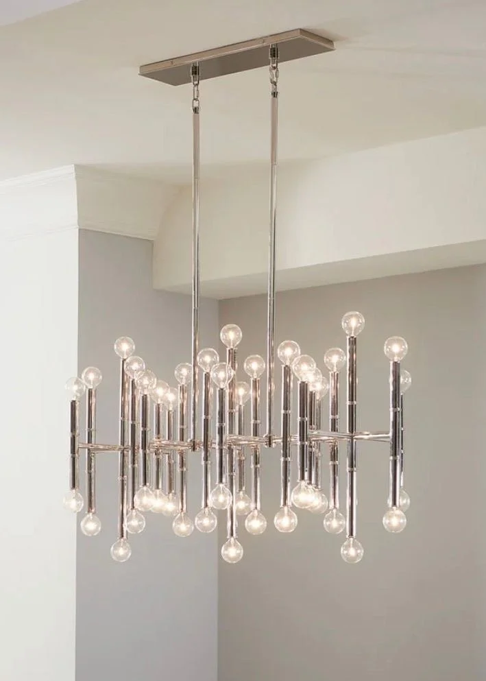 Designed by Kelly Wearstler, this flush mount in polished nickel is a delicate sculpture of radiating quills that casts a striated glow across the ceiling.