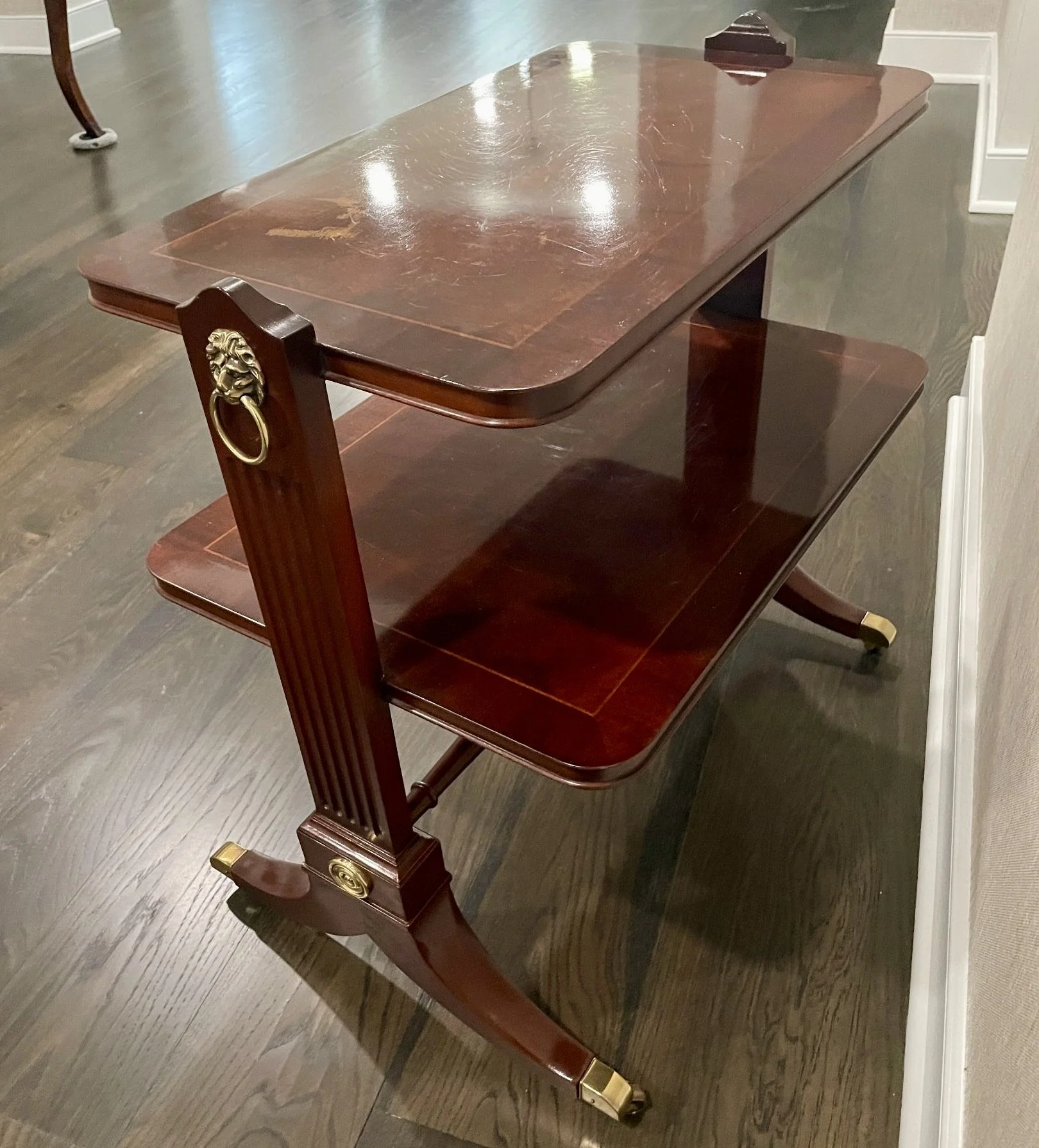 Flame Mahogany wood in two tiers and supported on brass tipped feet with casters. Lion pull and brass details. Top shelf shows some wear/age. Could be covered by book/lamp OR possibly touched up.