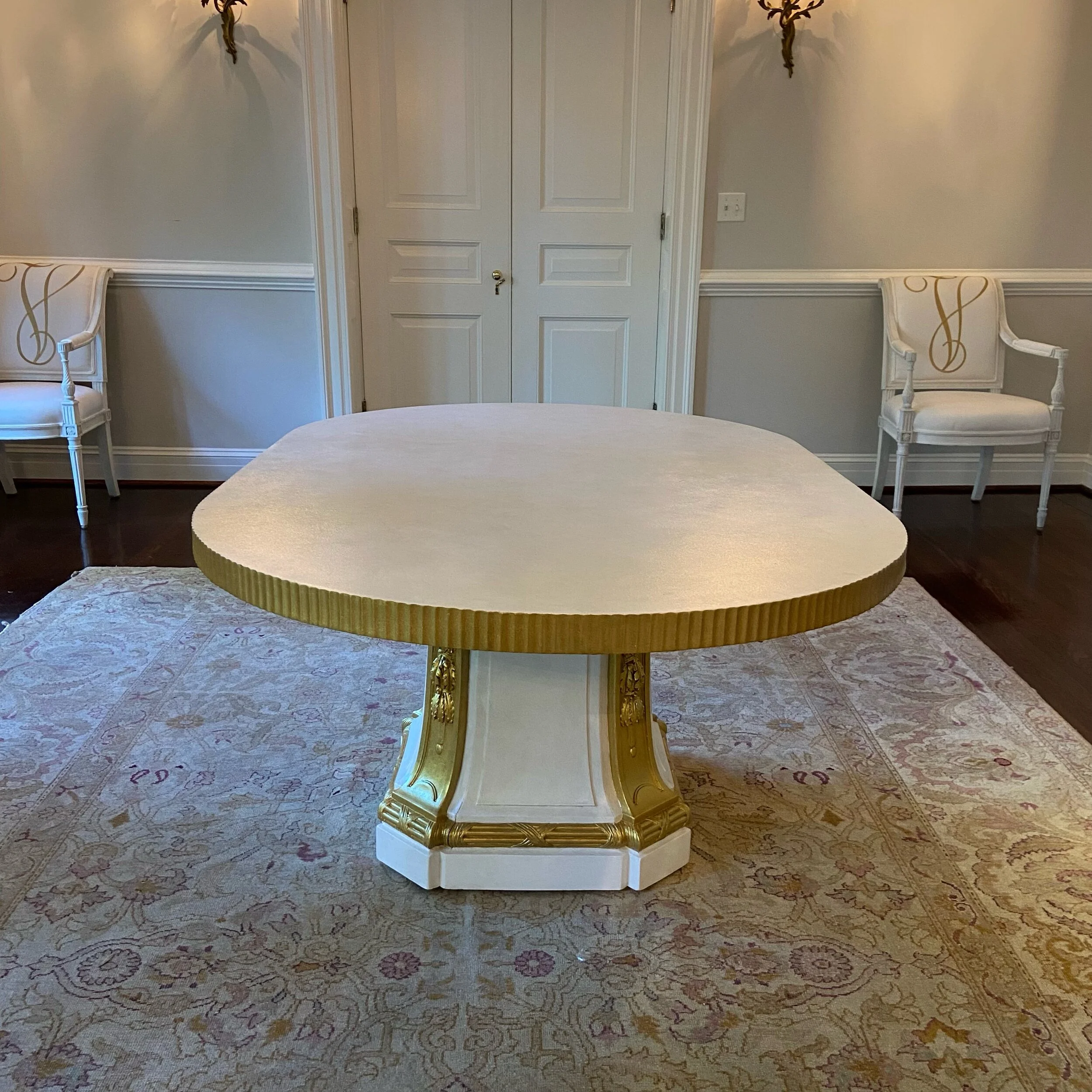 High profile, ornate neoclassical white baluster pedestal table is a stand alone find. The gilt accents make this piece shine and sparkle. Featured in a popular national design publication, this piece is a show stopper .